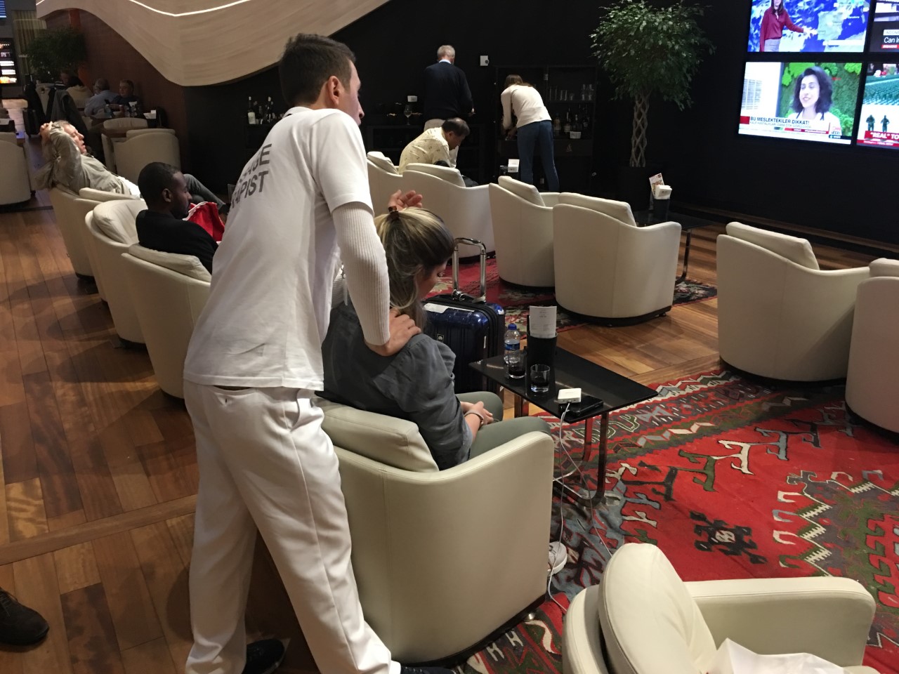 Et spesielt tilbud er en egen service for stryking av klær mens du venter i loungen, alt inkludert for den som har adgang til disse tilbudene. En egen massør rusler også rundt i lokalene med ujevne mellomrom, og tilbyr lett massasje for de som ønsker det.