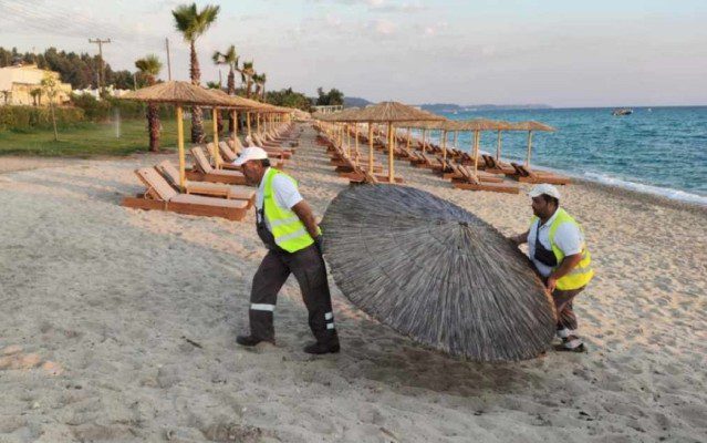 Teknikerne fjerner alle gjenstandene som er etterlatt av turister og innbyggere, som er etterlatt for å reservere en bestemt plass på strendene.