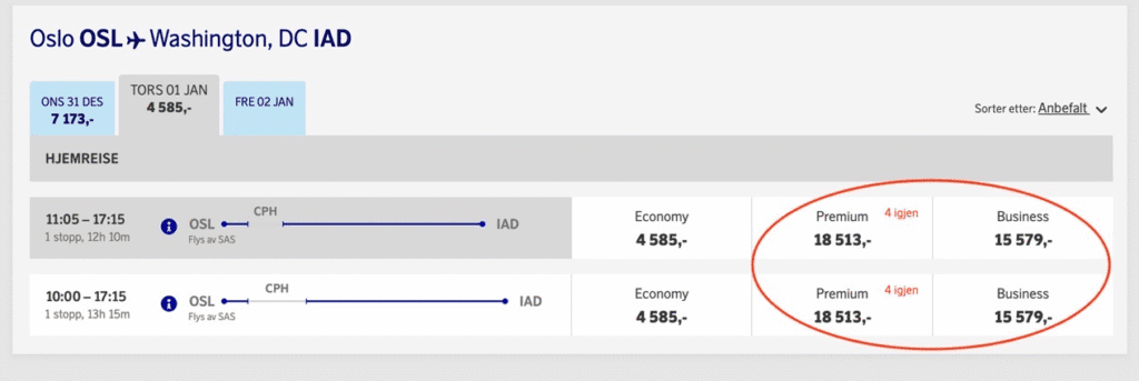 Hva er det som skjer med prissettingen i SAS når det absolutt beste og dyreste produktet SAS kan by på, plutselig er rimeligere enn en oppgradert økonomiklasse-billett?