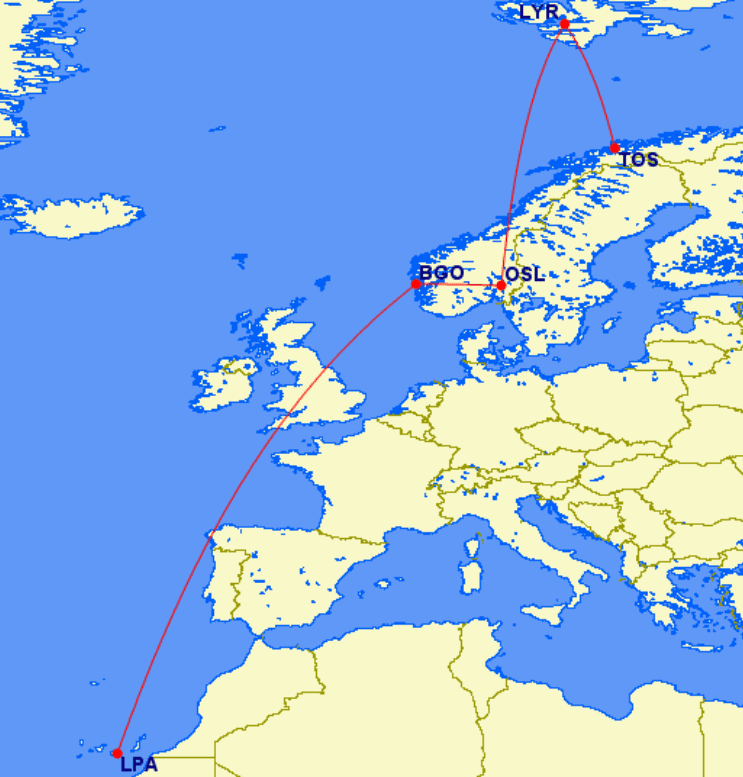 Dette var ruten de uheldige Tromsø-passasjerene måtte fly, for å komme til vinterferien på varme og solrike Gran Canaria: