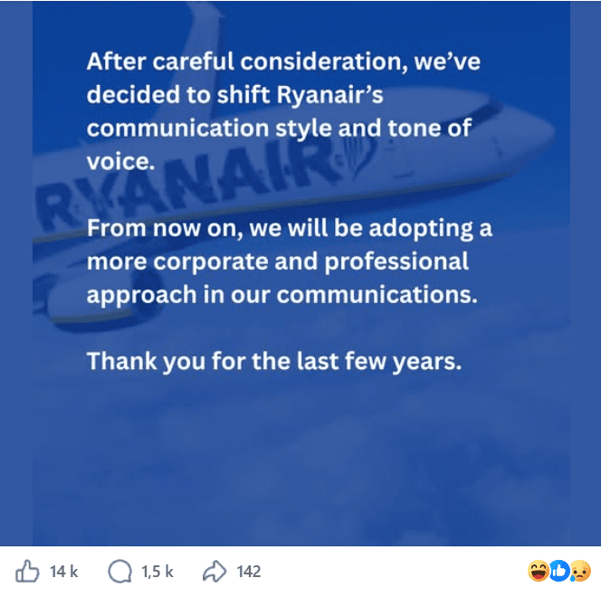 Dette har Ryanair bekjentgjort på sosiale medier. Tusener av kunder har reagert på denne beskjeden så langt.